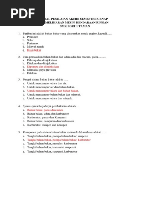 Soal mesin otomotif atau soal pemeliharaan mesin kendaraan ringan pmkr dapat digunakan sebagai soal ulangan harian soal ulangan akhir sekolah uas listrik otomotif atau soal uas pemeliharaan kelistrikan kendaraan.