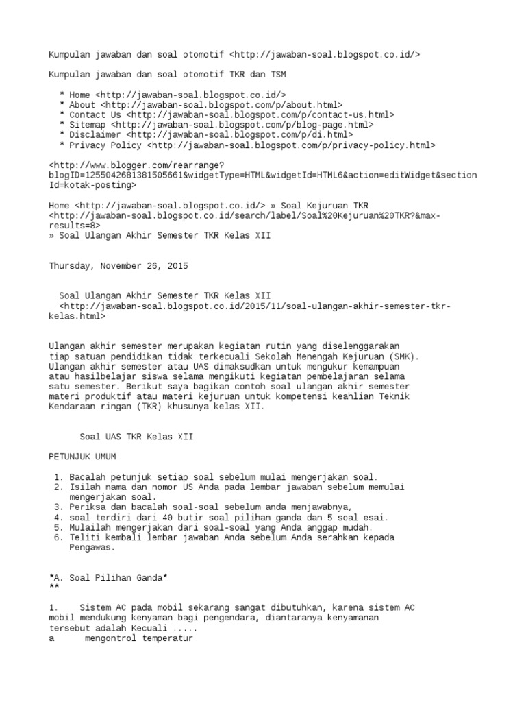 Soal uts chasis ganjil kls xi tokr ganjil 12 13 for kurikulum. Air kakus dan dapu e. Soal uas tkr kelas xi semester 1. Prediksi soal ujian teori kejuruan otomotif tkr smk 2012. Soal dan kunci jawaban soal engine dan komponennya.